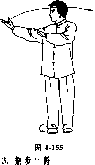身体左转,重心移向左腿,右 脚跟至左脚内侧,两脚平行;左掌 内旋屈肘提至右胸前,掌心向外; 右掌内旋托举于身体右侧,掌心 向上;目视右掌。(图4-155)