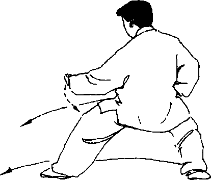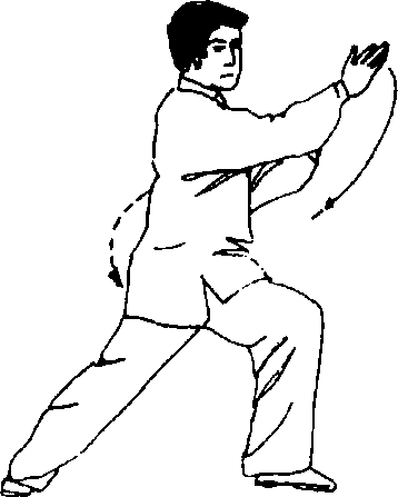 图 4-157图 4-157左腿屈弓,右腿自然蹬直成左侧 弓步;两掌在平捋中逐渐握拳, 左臂外旋,左掌向左划弧至左腰 侧握拳,拳心向上;右手握拳屈 肘外旋滚压至胸前;目视右拳。 (图 4-157)