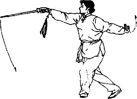 ② 上步要轻灵平稳,不可忽高忽低,上一步绞一剑,共上三步, 上步与绞剑要协调一致,连贯平稳,剑尖运转呈螺旋形。