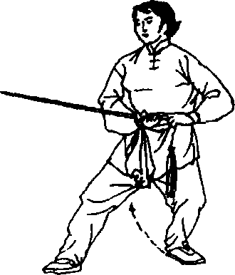 1-身体重心左移并稍左转,左腿屈膝,右腿伸直;同时右手持 剑随转体以剑柄领先,屈肘向左带剑至脸前,手心朝后,剑尖朝右, 与头同高;左手剑指弧形左摆至左胯旁,手心朝下,指尖朝前;目视 剑柄。(图6-34)