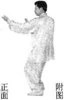 (3)重心左移,身体左转,左手屈肘内旋按掌,右手臂转掌划弧托起,与胸同 高,两手成托球势(图3-3 —6④)。