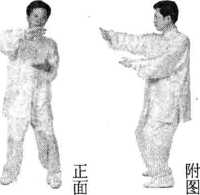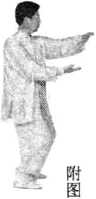 (5)手心向下,两臂前伸,同时两脚开步直立(图3-3-6⑥),随即两臂慢慢