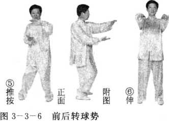 (2)重心不变,身体左转,左臂随转体向后屈肘回拉到胸腹间,同时右手心 向上,右手横掌向前、向下推按成左滚球势(图3-3-6③)。