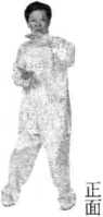 预备式:两脚开步直立,与肩同宽,头向上顶,全身自然放松,两臂下垂,两手 置于两腿外侧,手心向内(图3-3-60).