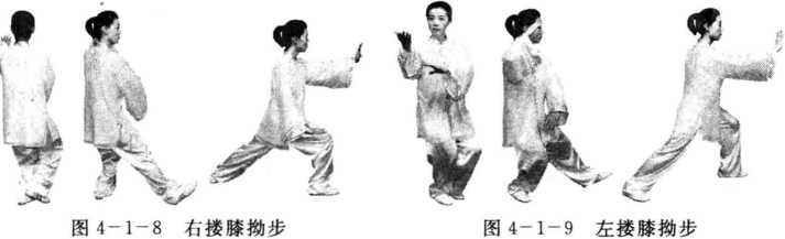 (2)右搂膝拗步:后坐撇脚,摆臂收脚,上步屈肘,弓步搂推(图4-1 -8)。