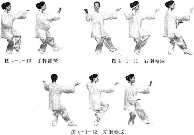 (1)右倒卷肱:稍右转体,撤步托球,退步卷胧,虚步推掌(图4-1-11).