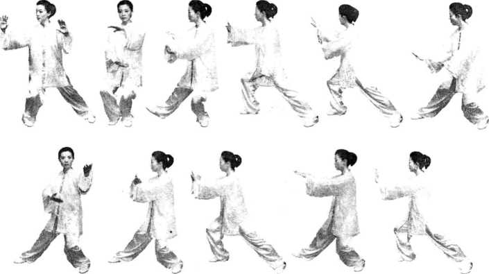 后坐扣脚,收脚抱球,转体上步,弓步搠臂,摆臂后捋,转体搭手,弓步前挤, 转腕分手,后坐引手,弓步前按(图4—1-14)。