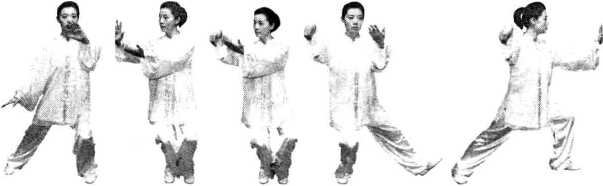 穿手上步,分手弓腿,收脚合抱,蹬脚分手(图4-1 -19)。