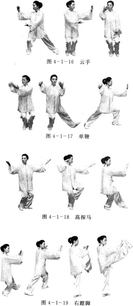 后坐扣脚,转体松勾,并步云手(图4-1-16)。开步云手连续做4个云手。