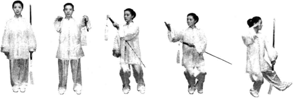 预备式:两脚并立,面向正南,身体正直,眼睛平视。虚领顶劲,两臂垂侧,左 手持剑,剑尖向上,右手剑指,手心向内(图4—2—1)。