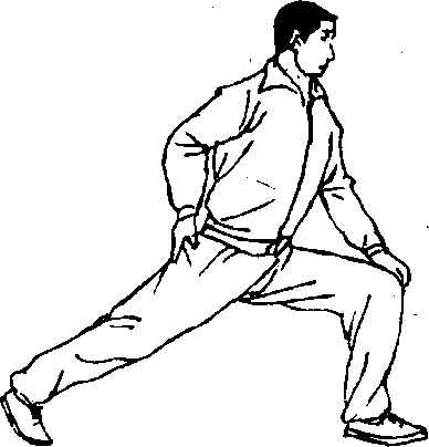 “弓步压腿”是一腿在前屈膝半蹲,另一腿在后挺膝伸直 的压腿练习。其主要作用是拉长髓关节前侧和前内侧的肌肉 和韧带。