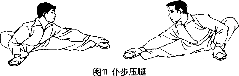 练习时,双手可扶在两髓关节前面的地上;也可用双手抓 住两脚的脚尖连续振压。