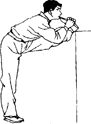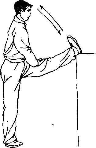 练习时,先将被压腿的脚跟放在支撑物(如肋木、台阶等) 上,脚尖上勾(或上翘),双手扶在膝关节上,正面做上体以髓 关节为轴的连续振压。