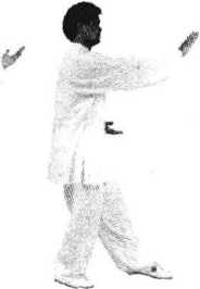 1. Move your right foot a half-step forward, gradually shifting your weight onto your right leg. Open your right hand and tum both palms up, elbows slighdy bent, while turning your body to the right slightly, raising your left heel gradually. Look at left forward (fig. 4-1-108).