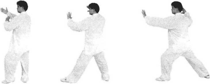 (3) Push the left palm forward, raise the right palm upward, and form into a left bow stance. The three movements should be coordinated.