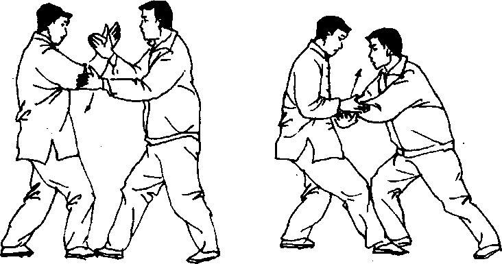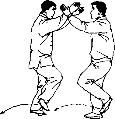 乙重心移至右腿,左脚提起,两臂继续向上、向内以手腕 为粘接点捧合甲前臂于面部前方,掌心斜相对;甲重心移至左 腿,右脚提起,两臂亦粘随乙臂向上、向内合,掌心斜相对。(图 223)