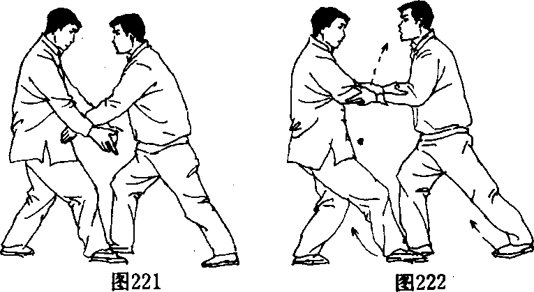 乙右手内旋循弧线上提向甲面部伸插,重心前移,右腿前 弓;甲随势重心后移,左腿屈膝,以右手韧劲承接乙右臂,上体 右转,右臂外旋屈肘,右手掌心向上,手背贴在乙右手腕上,向 下循弧线沉压乙右手至腹前,双方左手均扶于对方右肘部。 (图 219,220)