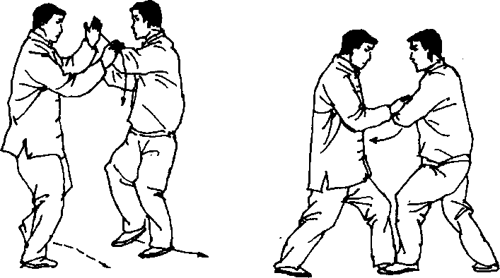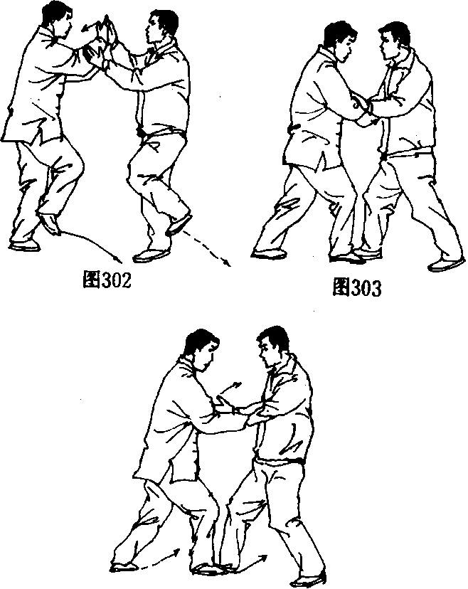 乙左脚向后撤步;甲左脚向前上步落于乙左脚内侧,上体 稍左转,左手内翻掌心贴于乙左手腕,向左、向下、向前按乙左 臂;乙右手脱开甲左肘附于左前臂内侧承接甲按劲。(图306)