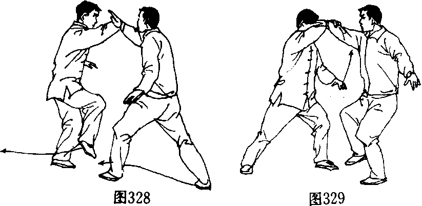 甲右脚向后撤一步,身体微右转,继续回带乙右臂;乙随 势右脚提起,身体微左转。(图329)