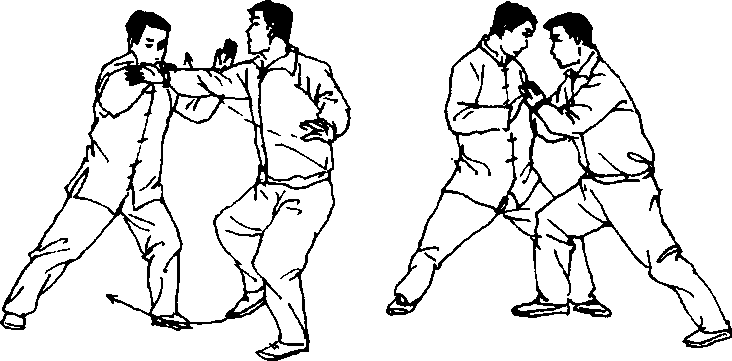 【攻防含义】 甲上体左转回正后,重心前移,向乙进击, 两手推按乙臂,形成一全身整劲,以按化反攻乙。