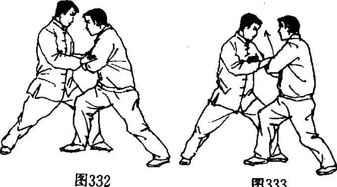 乙随势上体微右转,以左臂承接甲两手按势,右手向下、 向右绕出扶于甲左肘部。(图333)