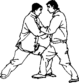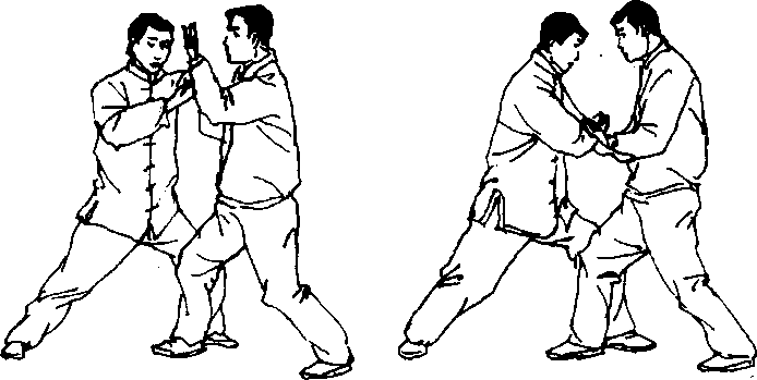 【攻防含义】 乙棚捋甲左臂,意在使甲重心升高后捋带 左臂,使甲失去平衡;甲则急应以右手扶左臂内侧,助力维持 身体平衡,待机变势。