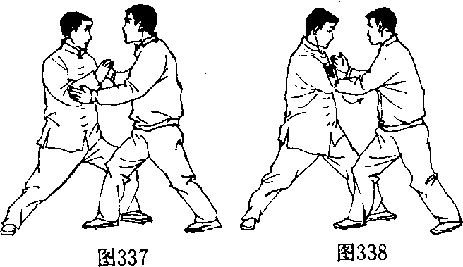 甲用右臂承接乙按势,左手由下向左绕出扶于乙右上臂 外侧,以左前臂托住乙右肘部,上体随势稍左转,右手内旋,用 中、食两指扣握乙右手虎口,拇指扣握乙小指侧掌根,左手托 掀乙右肘部,形成撅乙臂之势;乙顺势右臂屈肘,上体微左转。 (图 337.338)