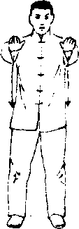 (2) 两手臂缓缓向前 平举至肩高,同肩宽,两肘 微下垂,手指微屈掌心向 下;目视两手。动作时吸 气,用意将丹田气提升贴于 脊背,此为升式.用意不用 力,自然稳重。(图1T0)