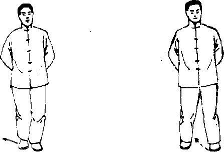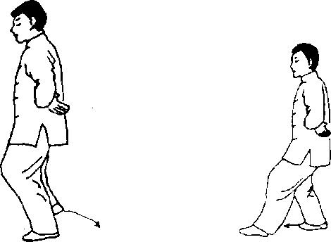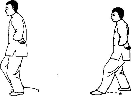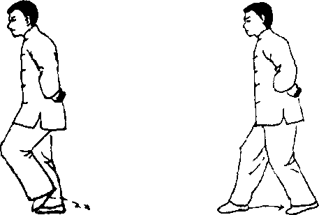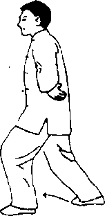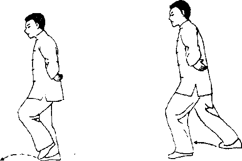 (2) 两臂屈肘两手背贴于后腰,掌心向外;重心全部 移至右腿,右腿屈蹲,左脚收于右脚内侧,向左前方上一 步;脚跟先着地,重心移向左腿,左膝屈弓,左脚踏实;目 视前方.此为第一步,(图1T5、46、47)