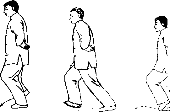 左腿屈膝提起,脚尖 脚跟先着地,重心逐 (图 1T0)