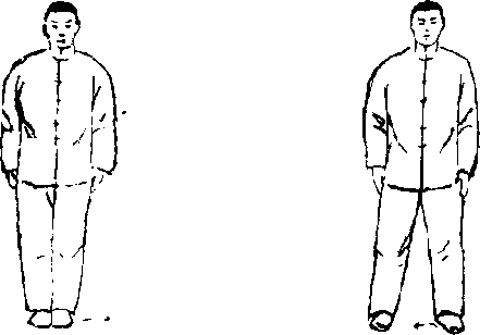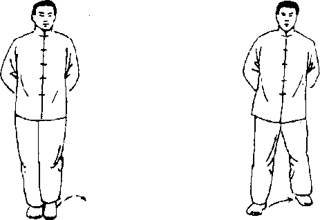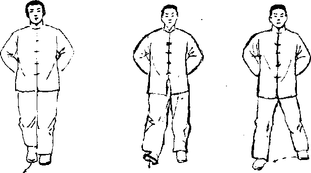 (9) 重心移向左腿,右脚经左小腿内踝向右落步与肩 同宽,成开立步.(图1TI)。收左脚;两脚并拢身体直 立,两手臂自然下垂,两手指尖轻附大腿两侧.(图1T2)