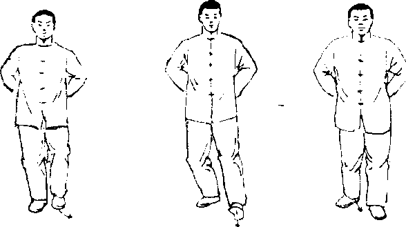 (4)重心全部移至右腿,右腿屈蹲,左脚提起收经右脚 内侧,向左落步;前脚掌先着地,而后左脚踏实,两脚略宽 于肩,两腿屈蹲,重心移至两脚之间;目视前方;此为第三