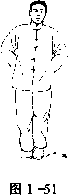 (2) 左脚向左开半步,与肩同宽,脚尖向前;两手背 分别贴于后腰两侧,掌心朝外,(图1-28)