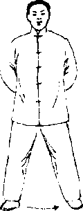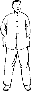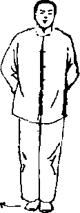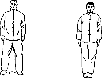 (1) 预备式:身体自然站立,两脚并拢,头颈端正, 下颌内收;肩臂松垂,两手手指轻贴大腿外侧;目视前方, 呼吸自然,(图1W7)