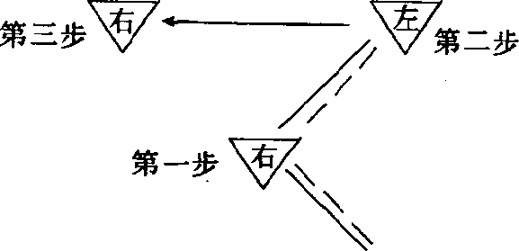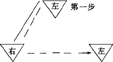 后落步(落在第一步的落点上);前脚掌先着地,重心后 移;右脚踏实.(图1T3、54)