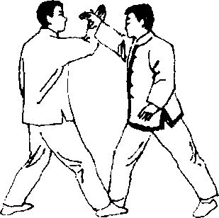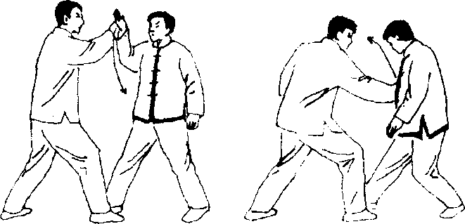 (4) 甲顺势将右手内 旋绕弧线上提向乙面部伸 插;乙又以右手用拥劲承甲 之来劲,重心后移,转腰坐 胯,将甲右手引向头部右 侧,(图 2-20)