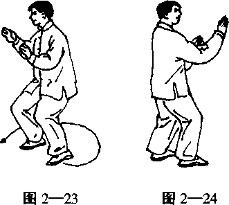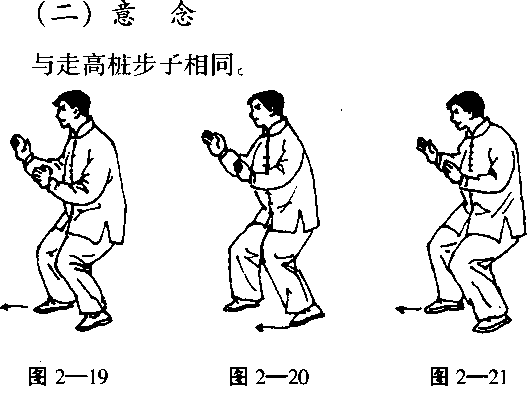 (一)方法左、右势走法与走高桩步子相同,惟屈膝程度 较中桩步子还要低一些(图2—19、20、21、22、 23、 24)。图 2—22(三) 要领 与走高桩步子相同。图 2—22(四) 要求每次左右势各走8趟,每趟走10 ~ 20步,每日 走1~2次。