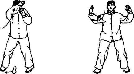 1.右靠法:上体稍左倾,右脚右跨半步,右臂 稍向左上抬起(图3—26),接着身体重心稍右移并 下沉,同时右肩背向右靠出,两臂屈肘+举,掌指 均向上;目视前方(图3—27)。 #