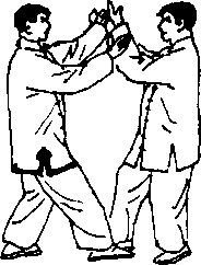 甲右脚前进一步,做按势;乙左脚后退一步,