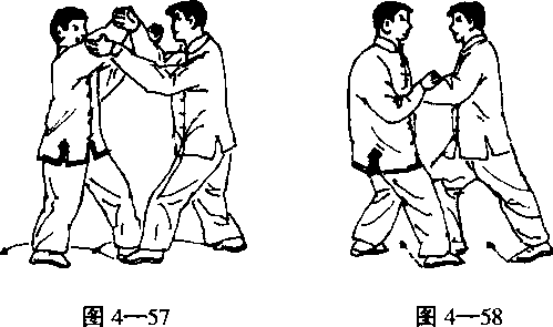 乙右脚刖进一步,右臂在則做挤势;甲右脚后 退一步,两手顺势后引乙挤劲(图4一58)。