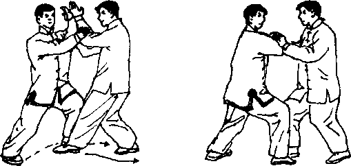 7.甲按捋、乙棚随甲向下、向左按捋,同时提起右脚准备进步; 乙松臂跟随,左脚也随之提起(图4一59)。