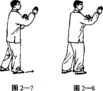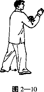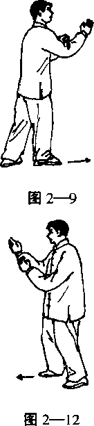 2— 7)。身体向前倾斜,迫使右脚向前进步(否则身 体就会向前栽倒)(图2—8)。左脚向前跟进一步, 催身体前倾(图2-9)。迫使前脚再向前进步(图 2 —10)。如此向前连续走步子。