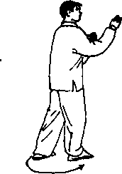 以上高势桩在走步子或转身的过程中不可散势, 身体不可忽高忽低。前脚进步和后脚前跟要在瞬间 完成。跟步时,后脚一落地,脚后跟即抬起,不可 以用脚跟进行行走。腰要前拥,两手向前上方用劲, 但肘不要离肋。转身时以前脚前掌为轴,腰带全身, 后脚轻搓地后转,转动快疾、轻稳。