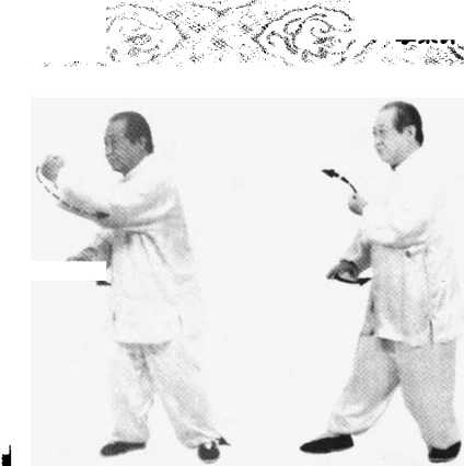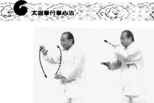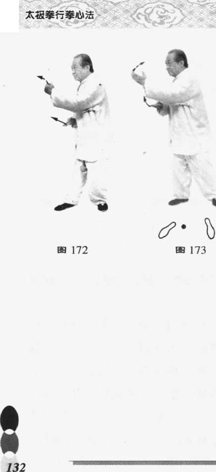 2.意气一定,左拳随钟锤返向 后荡而自然合回胸前;钟锤复向前 荡,左拳再次沿半圆形轨迹向前上 方圆转开出并舒展成掌。此为两合 两开云手的第一次开合;眼神凝视 左手所指的方向。(图171 ~ 173)