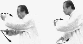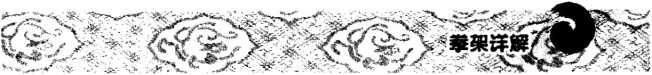 右转,右脚尖随之外撇;右手随前臂 内旋沿半圆形轨迹自上而下向右胯 旁滑落并下按,左手沿半圆形轨迹 自下而上收经胸前变拳,身体随钟 锤前荡而前移,左脚跟外旋,左拳外 翻以拳背中指根领先向前抛出。此