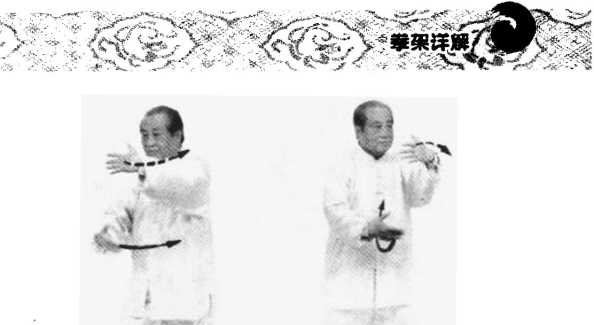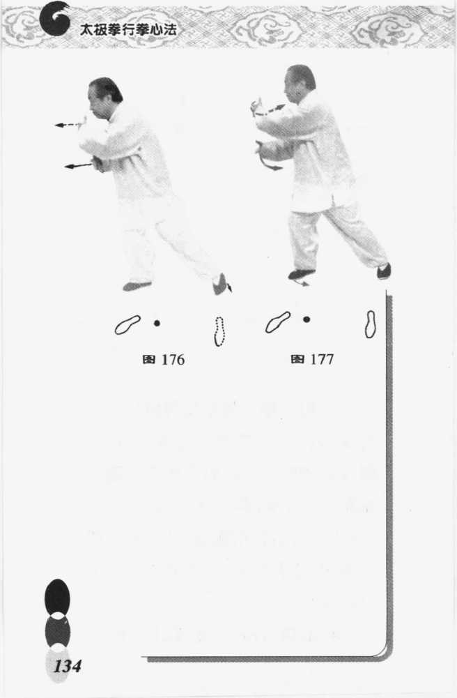 3 .以腰圈右旋带动两肘和身体 右转;同时两手随之外旋向右、向下 圆转云绕而后向胸腹前含合;随之 左脚向左开步,脚前掌、脚跟依次落 实,两手经右向前搠展开出,此为两 合两开云手的第二次开合。(图 174 ~177)