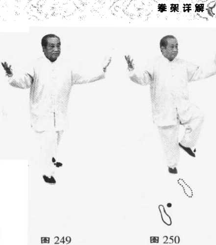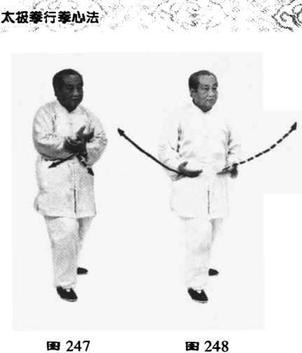 沉落,继而转以两手指尖领先向两侧 前方穿伸,意想如有藤萝绕挂在两前 臂上,立身便中正不偏,两臂的伸展 也沉稳均衡,无飘浮与偏沉之弊。(图 247 ?249)