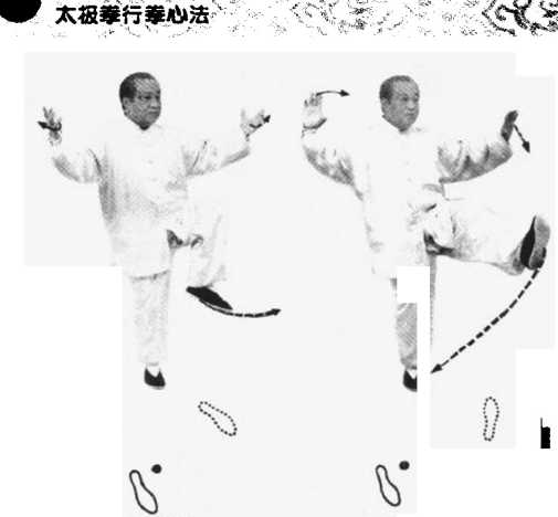 3 .心中一静,内气下沉;两前臂 内旋通出内缠丝裹合着捋内劲;左腿 不经意地提起,脚尖翘起,由左脚涌
