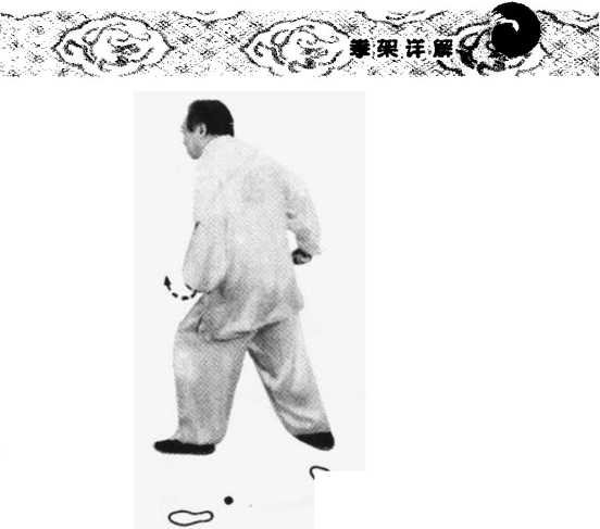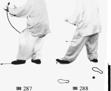 弹出的大气球接回两手中,心中一 静,内气下沉,由尾闾弧形通向两手 中间;左脚随之自如地向前移步。(图 287.288)