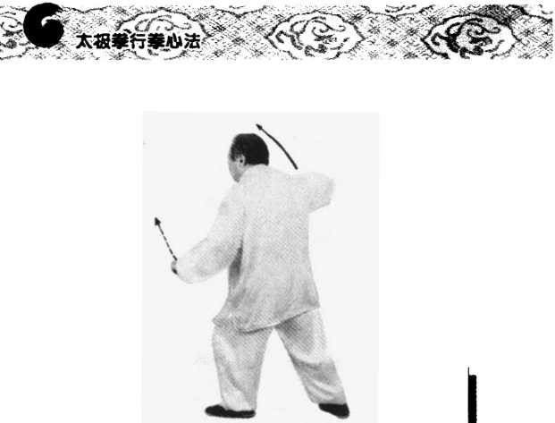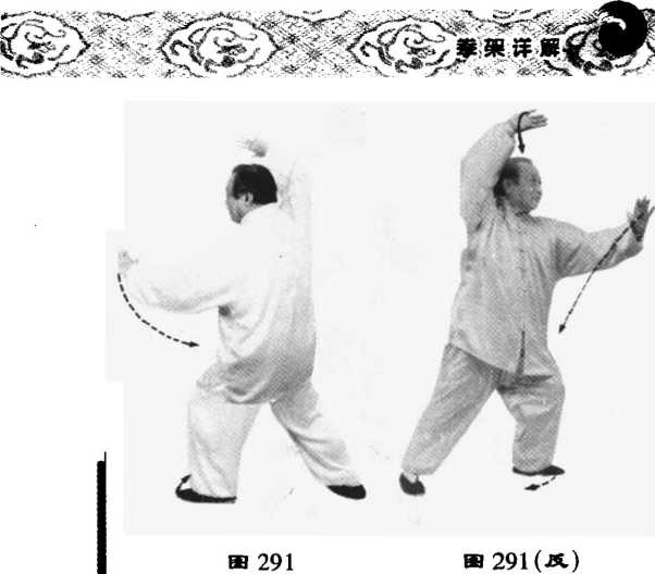 3 .气球逐渐向上、向外扩展直 至笼罩全身。周身被天地间的浩然正 气所贯通,带动两手渐渐内旋,依圆 球扩展之势向四外圆展,左手扶向圆 球的前侧,右手贴向圆球的顶部;身 中垂直线移向二点,三关之意自头后 侧向前上方舒展延伸(前长),周身气 势随之而升腾。(图290、291)